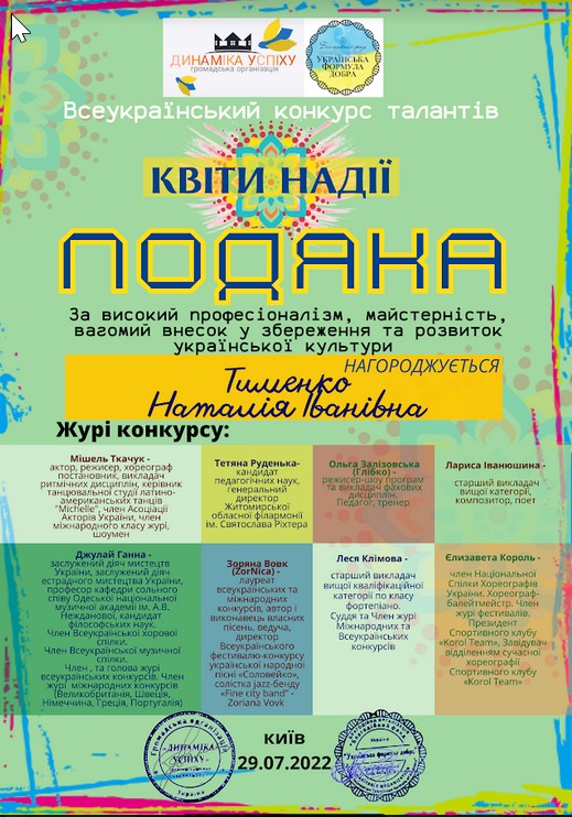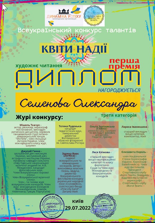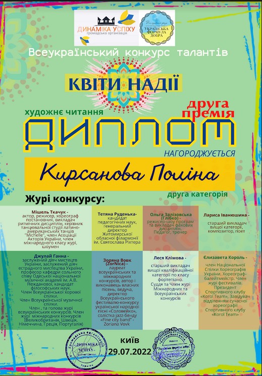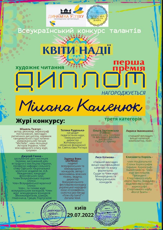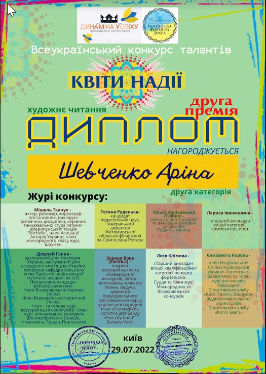 Група "Черрі-беррі" Народного вокального колективу "Веселочка" керівник: Вишняк О.О. та ЗРАЗКОВА ТВОРЧА СТУДІЮ "ЧАБРЕЦЬ" та керівник: Тименко Н.І. взяли участь у Всеукраїнському конкурсі талантів "Квіти надії", та отримали ГРАН ПРІ у номінації "кіномистецтво" та призові місця у номінації "шоу композиції" та художнє читання.