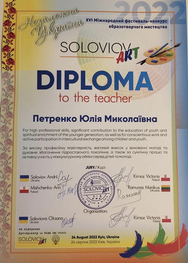 Соломаха Марк, вихованець гуртка «Академія олівця», керівник Петренко Ю.М., посів почесне 1-ше місце у Міжнародному фестивалі-конкурсі SILOVIOVArt. Його робота «Кобзар» буде експонуватися на виставці «Незалежна Україна» в Центральній бібліотеці ім. Т.Г.Шевченка для дітей м. Києва.