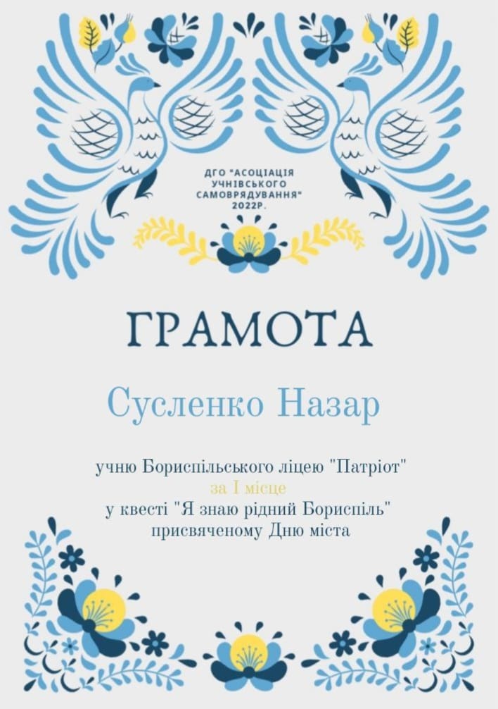 - Ліцей "Патріот" Сусленко Назар - 1 місце