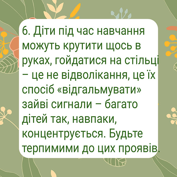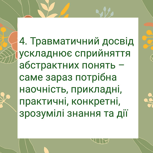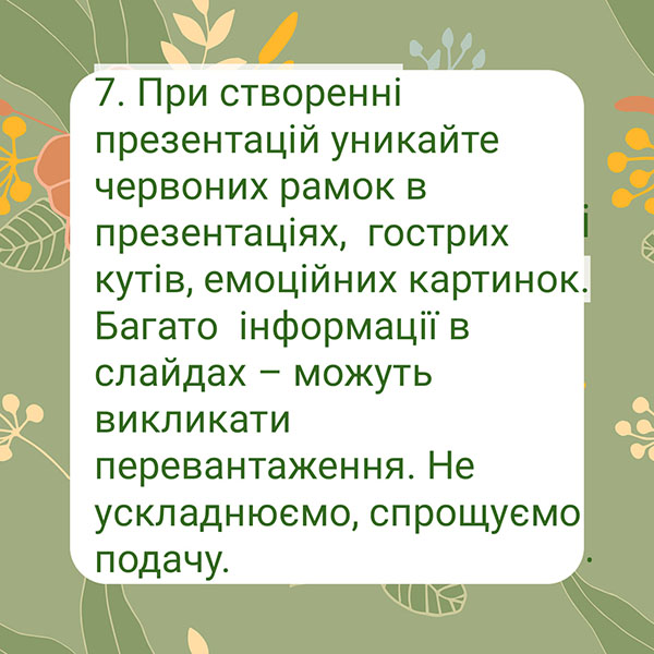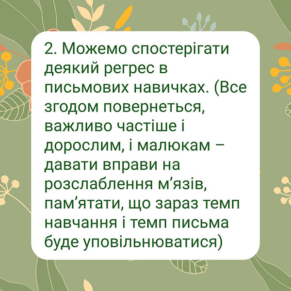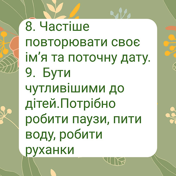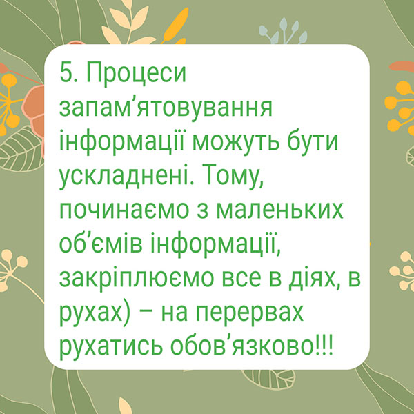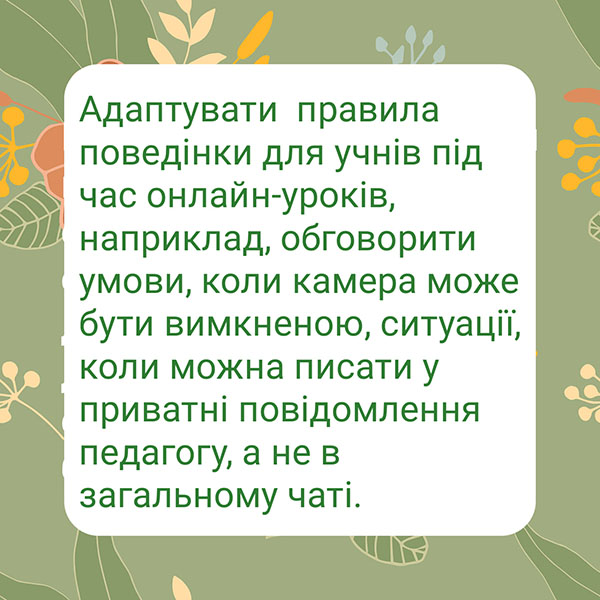 Будь – який процес навчання починається з відчуття безпеки. (наскільки це зараз можливо). Безпека – це наша передбачуваність, знання території, зрозумілі правила. Потрібно більше інформації – пояснень, структури, потрібно розповідати – що за чим буде йти по діях.