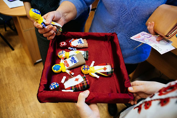 Сьогодні у нас ярмарка в управлінні освіти та науки: ляльки-обереги, значки, прапорці, браслети, підвіски в машину та інше.