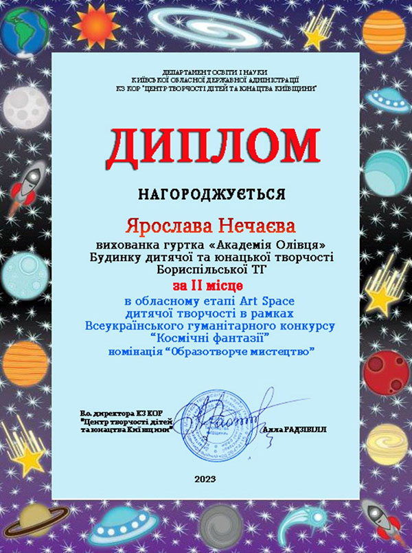 Вітаємо Ярославу Нечаєву з перемогою в обласному етапі «Art Space» дитячої творчості в рамках «Всеукраїнського гуманітарного конкурсу «Космічні фантазії».