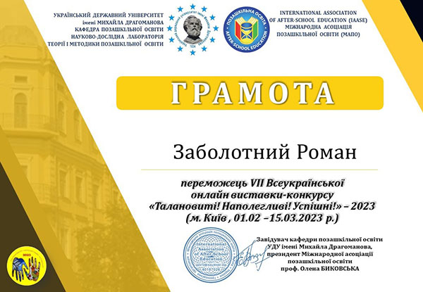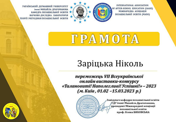 Наші перемоги у VII Всеукраїнській онлайн виставці-конкурсі "Талановиті! Наполегливі! Успішні!" - 2023