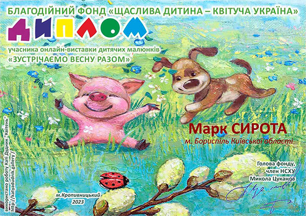 Зразкова студія образотворчої діяльності «Райдуга» приймали участь в онлайн виставці «ЗУСТРІЧАЙМО ВЕСНУ РАЗОМ» разом з Конкурс дитячих малюнків «Щаслива дитина — квітуча Україна». Вітаємо учасників. І нагороджуємо пам’ятними дипломами за участь.