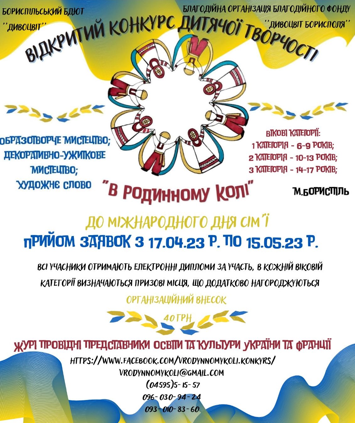 Наш заклад Бориспільський БДЮТ «Дивоцвіт» за підтримки Благодійної організації Благодійного фонду «Дивоцвіт Борисполя» організовує Відкритий конкурс дитячої творчості «В родинному колі». Запрошуємо до участі дітей від 6 до 17 років, в номінаціях: образотворче мистецтво, декоративно-ужиткове мистецтво, художнє слово.