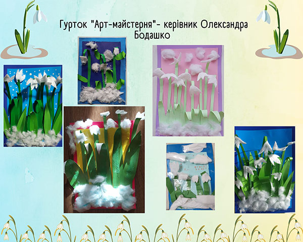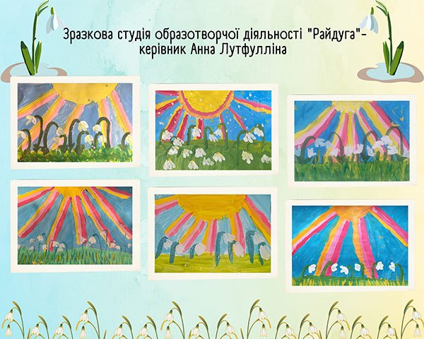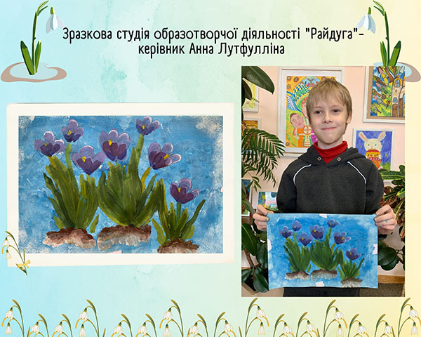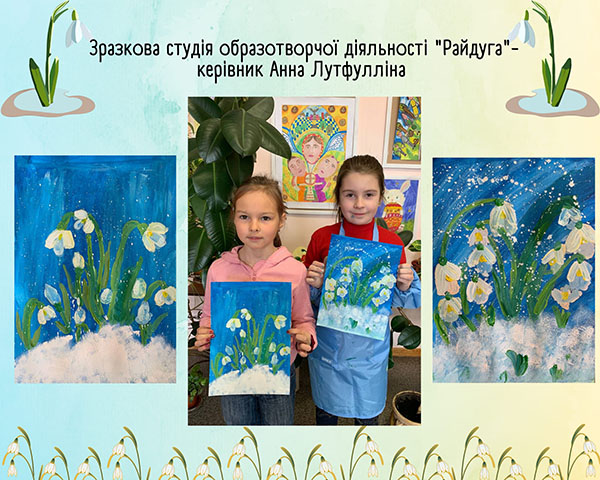 А чи чули ви, що 19 квітня у багатьох країнах світу відзначають День підсніжника? Більшість інформаційних джерел стверджують, що це свято походить з Великої Британії, чим і пояснюють вибір такої пізньої дати для встановлення цього дня, адже цвітіння квітки, яка вважається провісником весни, начебто випадає там аж на середину квітня. З приводу походження свята та правильної назви інформація різниця, це не офіційне свято, але це чудовий привід укотре нагадати всім, що підсніжник, як і багато інших первоцвітів, перебувають на межі зникнення та входять до Червоної книги України; сформувати дбайливе ставлення до червонокнижних квітів і природи загалом. Ми в свою чергу пропонуємо вам помилуватись першоцвітами на творчих роботах наших маленьких митців.
