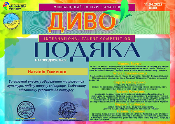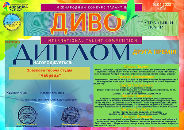 Вітаємо Зразкову творчу студію "Чабрець" та Наталія Іванівну з черговою перемогою. МІЖНАРОДНИЙ КОНКУРС ТАЛАНТІВ "ДИВО-2023".
