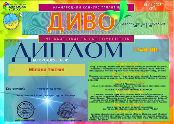 Символічна робота, символічна назва. Перемога справжня. Вихованка гуртка "Модниця", Тютюн Мілана, керівник Ірина Федорченко Гран-прі на Міжнародному конкурсі талантів "Диво-2023"
