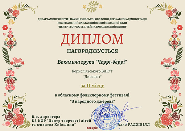 Вітаємо вокальний колектив "Чері-бері" та його керівника Олену Вишняк з творчими здобутками. Успіхів та натхнення!!!