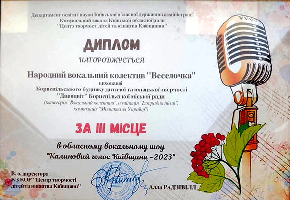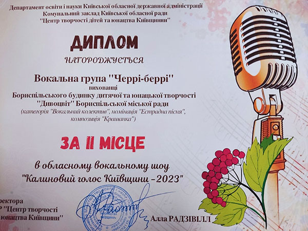Кращих із кращих обирала когорта професіоналів у галузі вокального мистецтва. Отож, Вітаємо з Перемогою колективи Бориспільського БДЮТ "Дивоцвіт" - 2 місце вокальна група "Чері-бері", керівник Олена Вишняк та 3 місце - Народний вокальний колектив "Веселочка", керівник Яна Новоселецька.