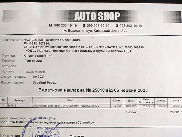 Частина зібраних грошей (20 тисяч) була витрачена на придбання потужних акумуляторів для воїнів 67 ОМБр ДУК, які зараз на передовій.