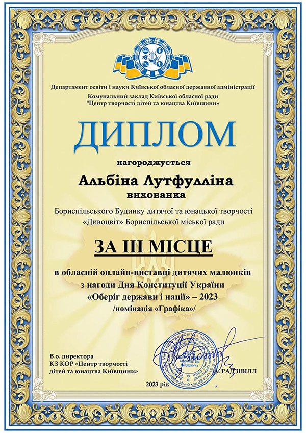 Вітаємо Лутфулліну Альбіну за зайняте ІІІ місце в обласній онлайн-виставці дитячих малюнків з нагоди Дня Конституції України «Оберіг держави і нації»!