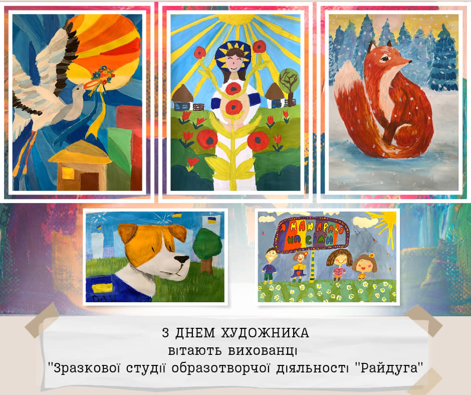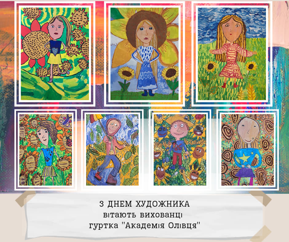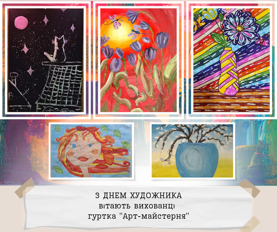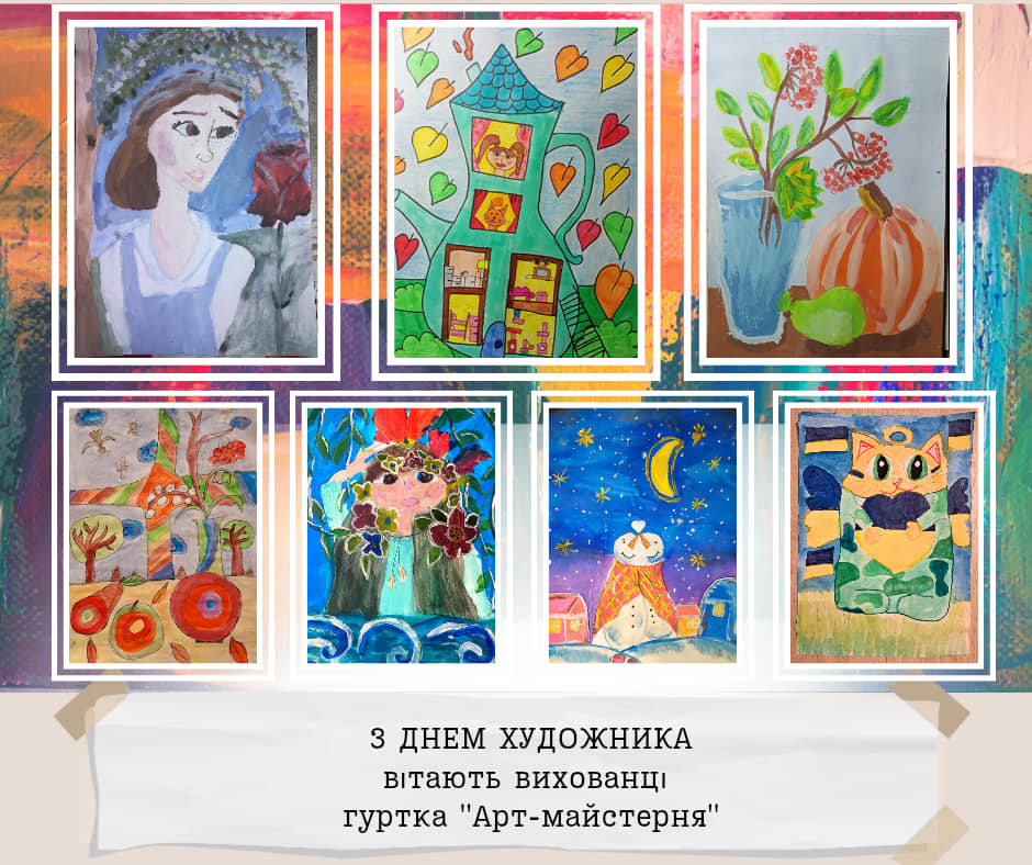 Дорогі друзі, щорічно у другу неділю жовтня, Україна святкує День художника! Символічно, що його ми відзначаємо у пору золотої осені, коли сама природа розгортає яскраве живописне полотно. Ми пишаємось творчими доробками вихованців закладу та запрошуємо вас поринути у дивовижний світ мистецтва в яскравих дитячих малюнках. Щиросердно бажаємо всім майстрам пензля невичерпної наснаги, нових цікавих ідей, щастя, здоров’я і добра.
