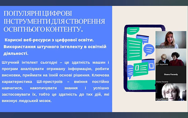 На першу онлайн зустріч зібралось більш 30ти педагогів з різних куточків Київської області, на занятті розглянули питання цифровізації, як важливої складовою освітнього процесу; цифрову компетентність сучасного педагога; рамку цифрової компетентності педагогічних і науково-педагогічних працівників. А також: цифрова ідентифікацію педагога, можливості і практичне застосування блогів, популярні цифрові інструменти для створення освітнього контенту, корисні веб-ресурси з цифрової освіти та використання штучного інтелекту.