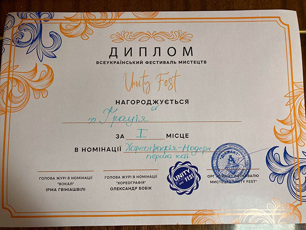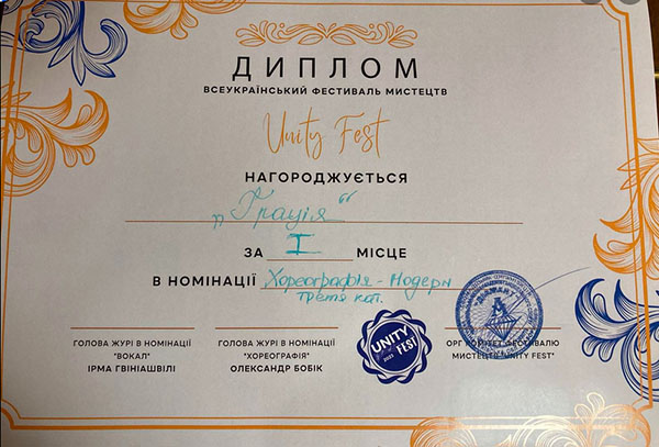 Народний хореографічний фестиваль "Грація" стали переможцями Всеукраїнського фестивалю мистецтв "Uniti Fest" у номінації хореографія - модерн.