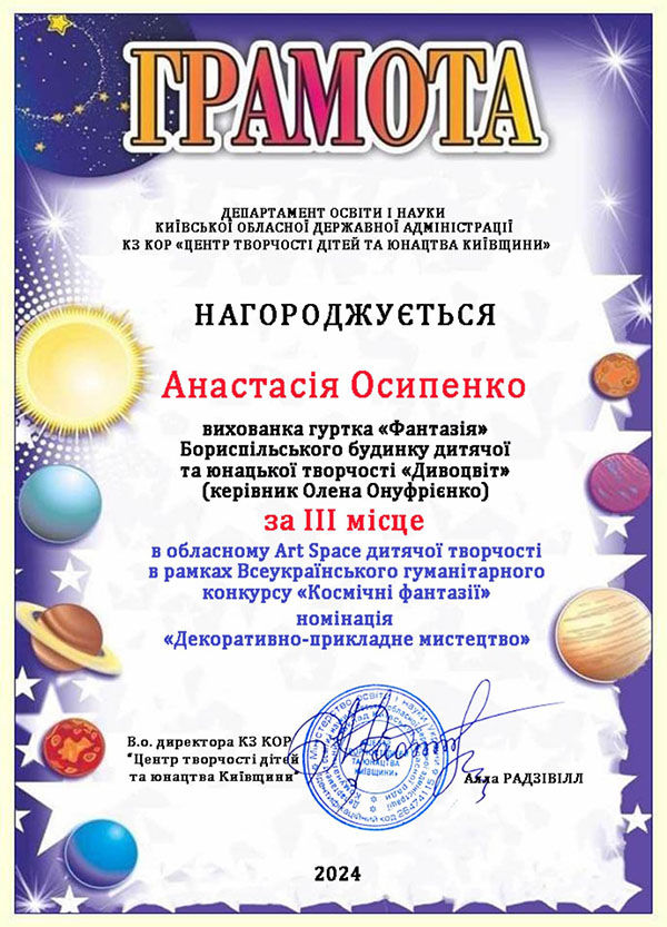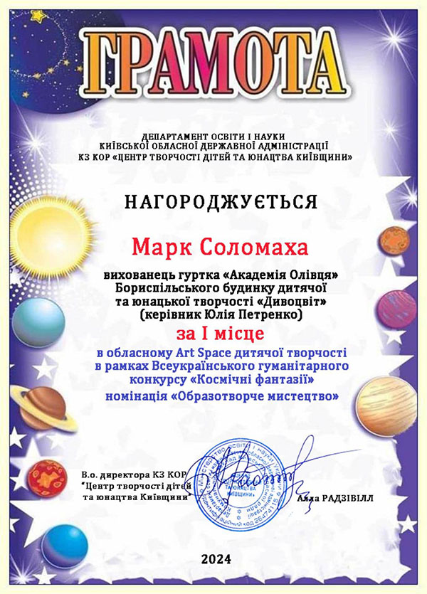 Вихованець гуртка «Академія олівця» Соломаха Марк виборов 1 місце, а вихованка гуртка «Фантазія» Осипенко Анастасія посіла 3 місце в обласному Art Space дитячої творчості в рамках Всеукраїнського конкурсу «Космічні фантазії».