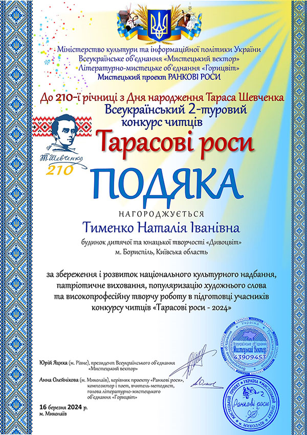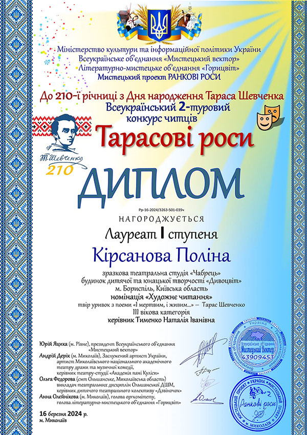 Вихованки Зразкової творчої студії "Чабрець" Бориспільського БДЮТ "Дивоцвіт" отримали перемоги у Всеукраїнському конкурсі читців "Тарасові роси".