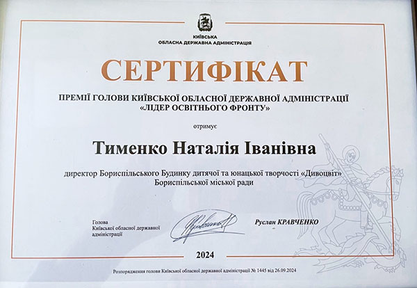 Колектив Бориспільського БДЮТ "Дивоцвіт" вітає Тименко Наталію Іванівну з почесною відзнакою - "Освітянська звитяга Київщини" та премією голови Київської обласної державної адміністрації «Лідер освітнього фронту». Бажаємо Вам незгасного запалу і щоб Ви виховали ще не одне гідне, розумне та освічене покоління. Так тримати!!!