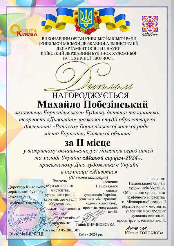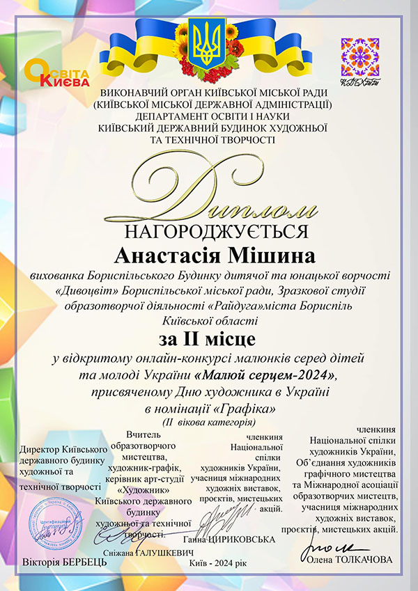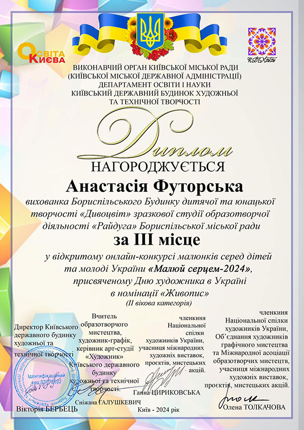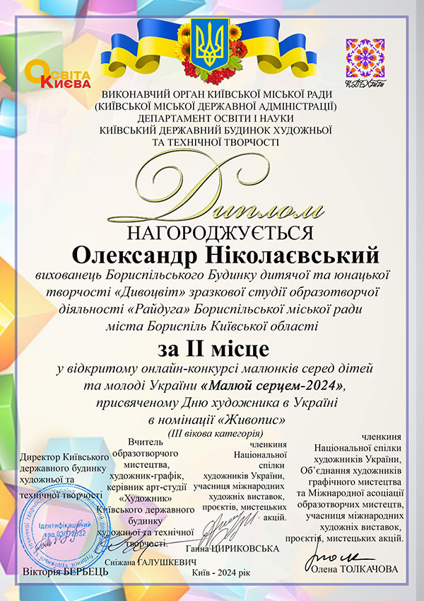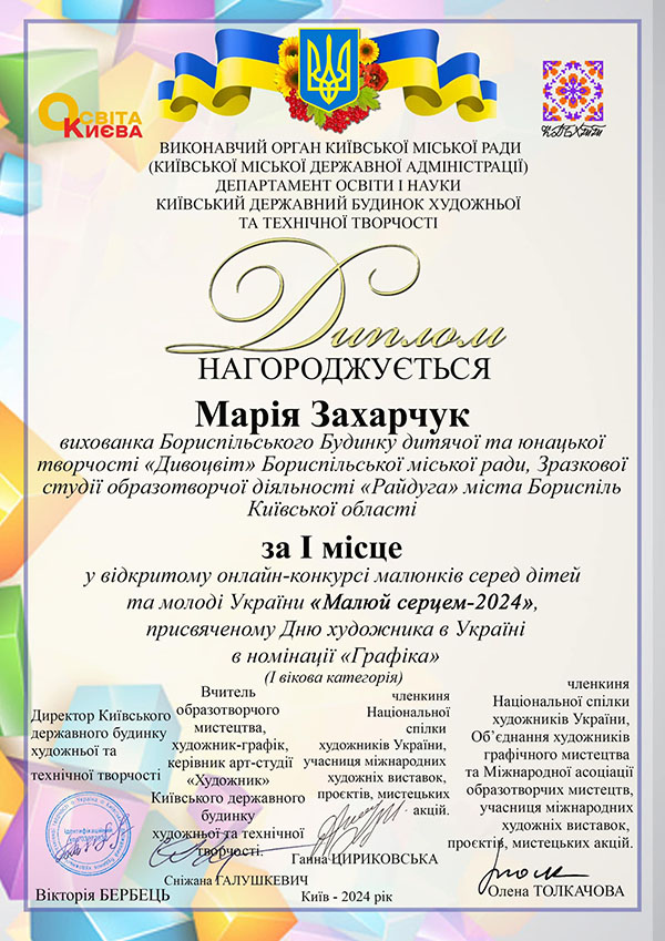 Вітаємо з перемогами у Відкритому онлайн-конкурсі малюнків серед дітей і молоді України «Малюй серцем-2024», присвяченому Дню художника в Україні, вихованців Зразкової студії образотворчої діяльності «Райдуга»: