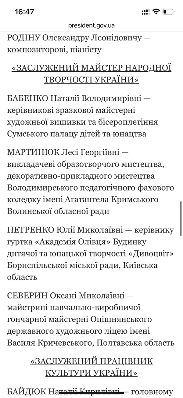 Відповідно до Указу Президента України #752/2024 від 09.11.2024 Петренко Юлії Миколаївні присвоєно почесне звання "Заслужений майстер народної творчості України". Подання про присвоєння цього звання ініціювало Управління культури Бориспільської міської ради. Петренко Юлія Миколаївна - майстриня творчого клубу «Спілка митців Борисполя», керівник гуртка «Академія Олівця» Бориспільського БДЮТ "Дивоцвіт", член Національної спілки художників України.