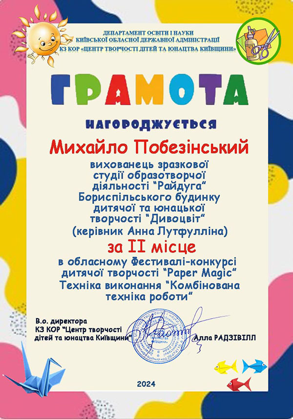 З перемогою в обласному Фестивалі-конкурсі дитячої творчості «Paper Magic”: