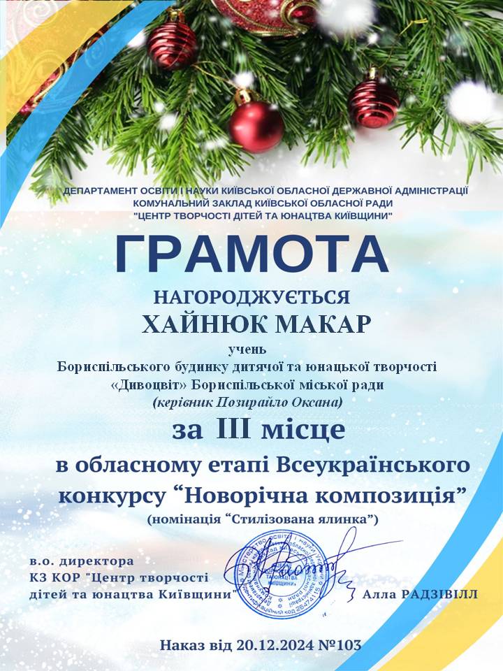 - Макар Хайнюк (керівник Оксана Позирайло) - 3 місце (номінація "Стилізована ялинка");