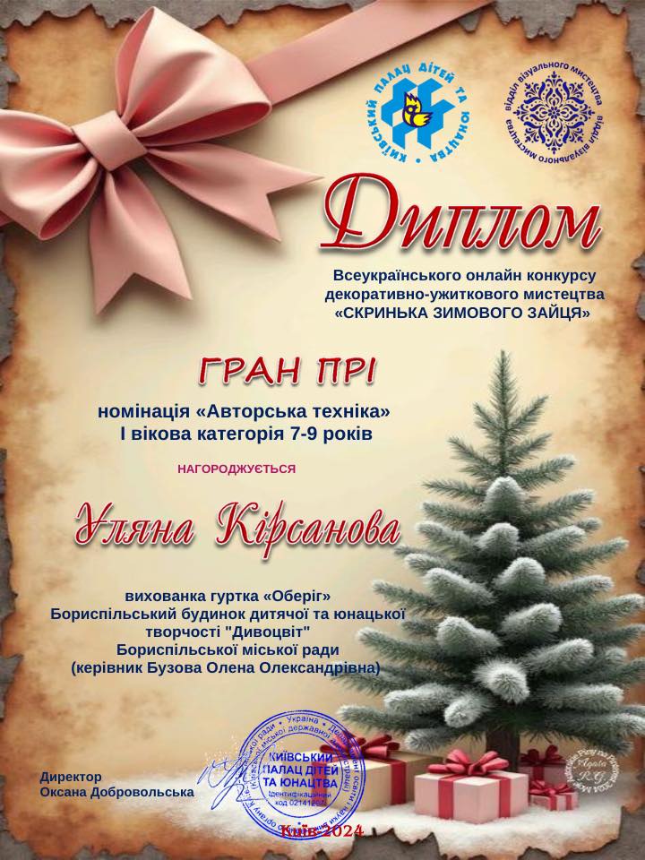 - Кірсанова Уляна - Гран-Прі; Янкова Олександра - 1 місце (гурток "Оберіг", викладач Бузова Олена Олександрівна).