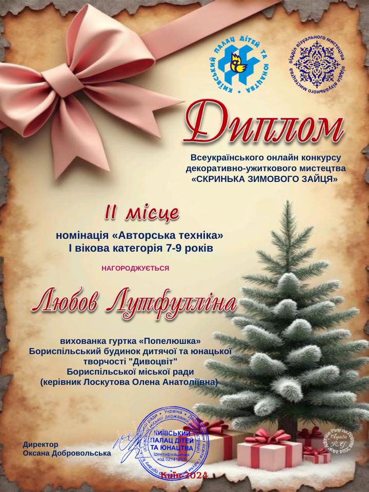 - Шевчук Злата - 1 місце; Лутфулліна Любов - 2 місце (гурток «Попелюшка», викладач Лоскутова Олена Анатоліївна).