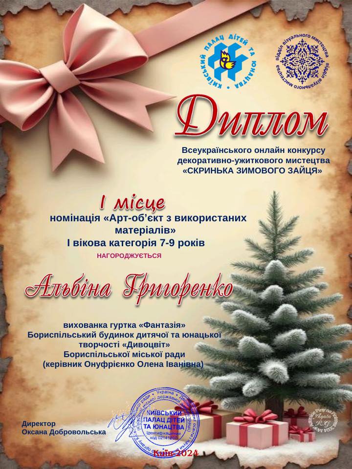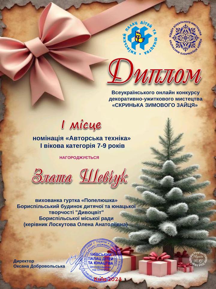 - Хайнюк Макар - 1 місце (гурток «Оберіг», керівник Хайнюк Олена Іванівна).