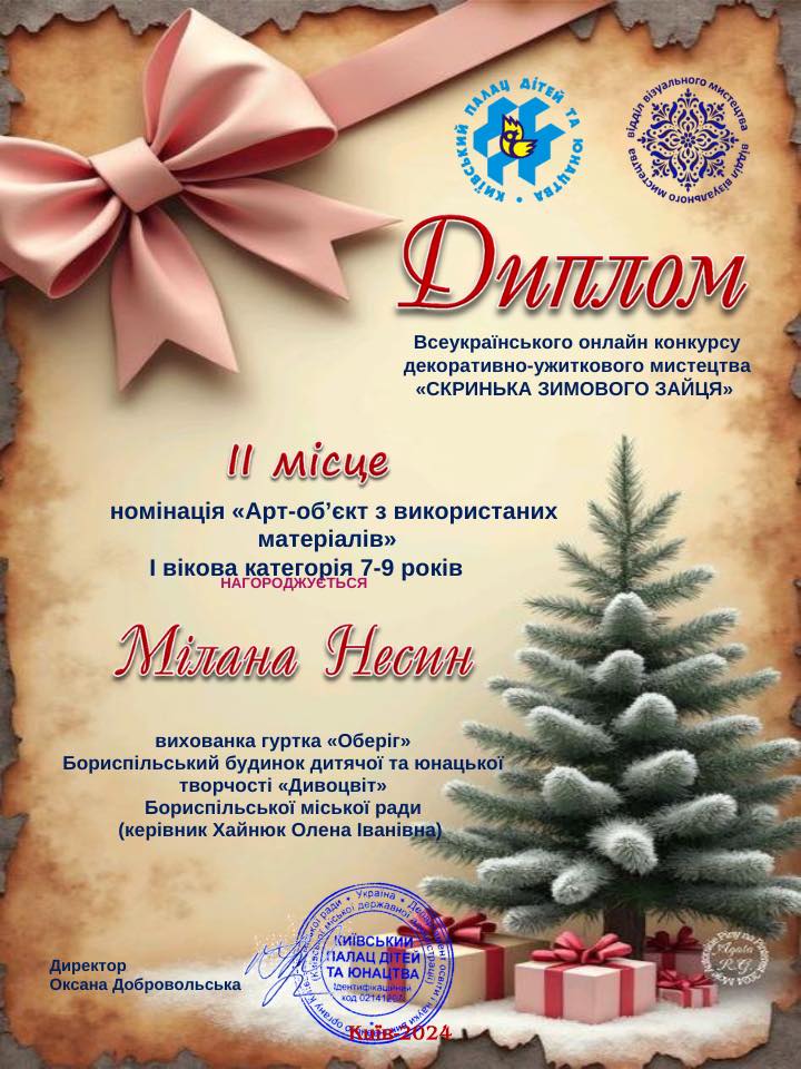 - Несин Мілана - 2 місце (гурток «Оберіг» керівник Хайнюк Олена Іванівна).