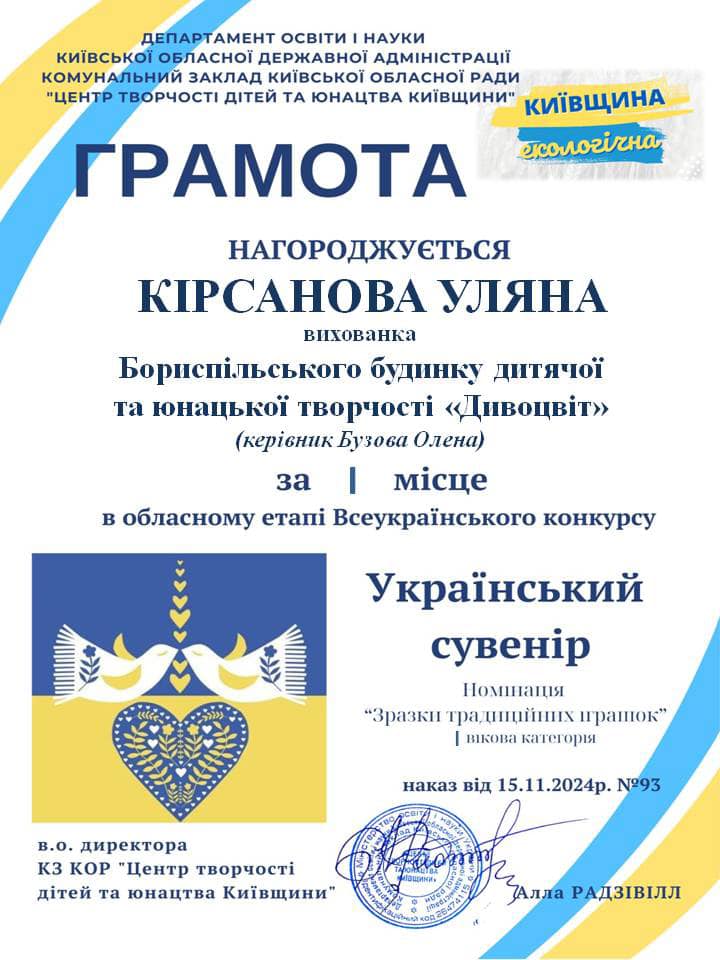 - Кірсанову Уляну - 1 місце (гурток «Оберіг», керівник Бузова Олена);