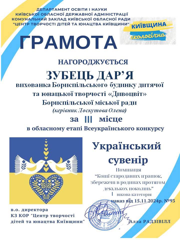 - Зубець Дар'ю - 3 місце (гурток «Попелюшка», керівник Лоскутова Олена).