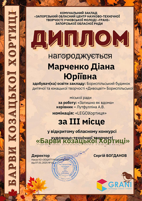 - Марченко Діану - 3 місце;