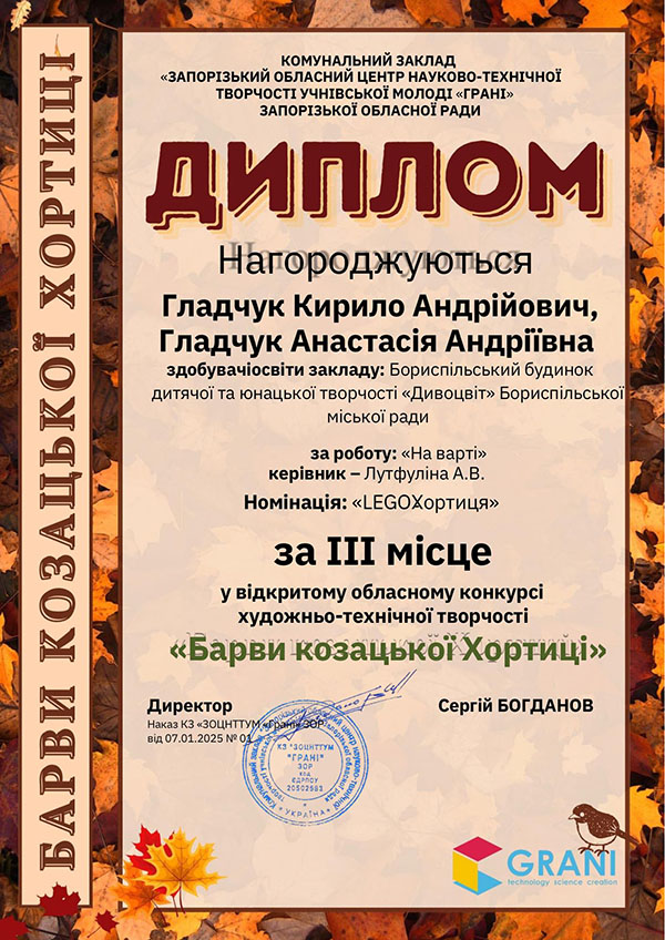 - Гладчук Кирила та Гладчук Анастасію - 3 місце.