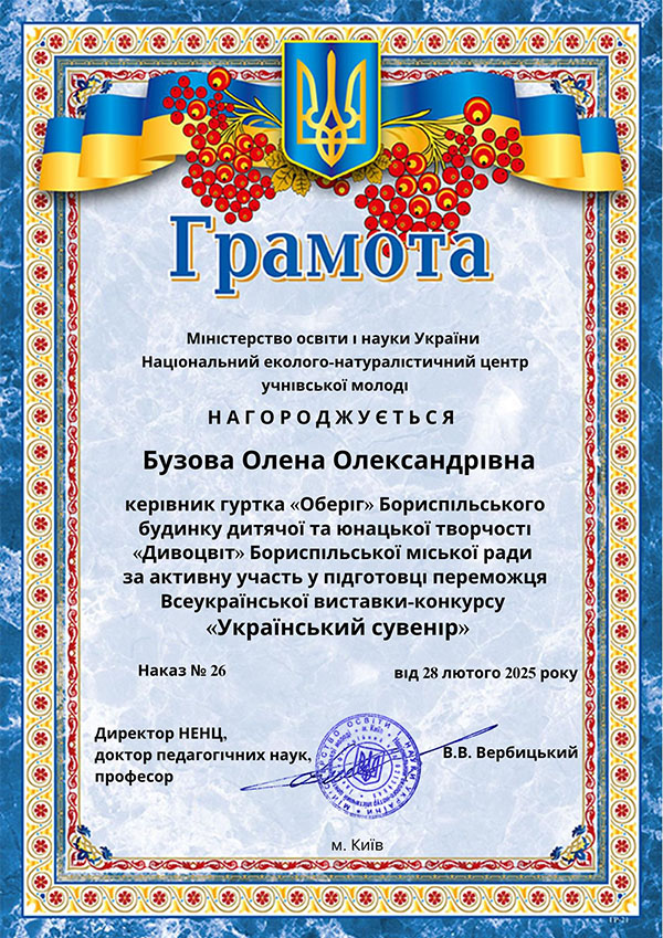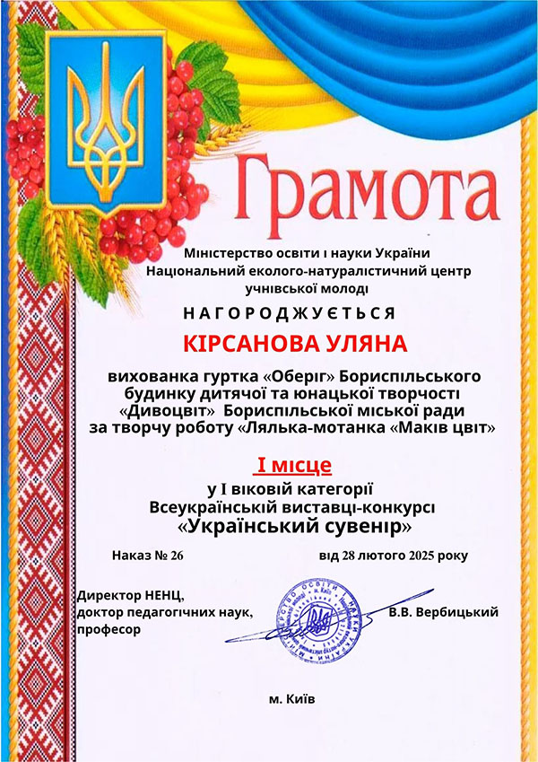 Кірсанову Уляну, вихованку гуртка «Оберіг» за творчу роботу «Лялька-мотанка «Маків цвіт». I вікова категорія у Всеукраїнській виставці-конкурсі «Український сувенір». Керівник Олена Бузова.