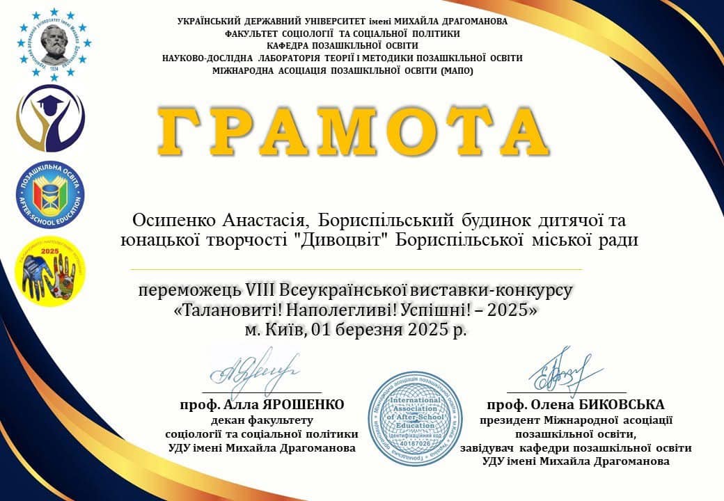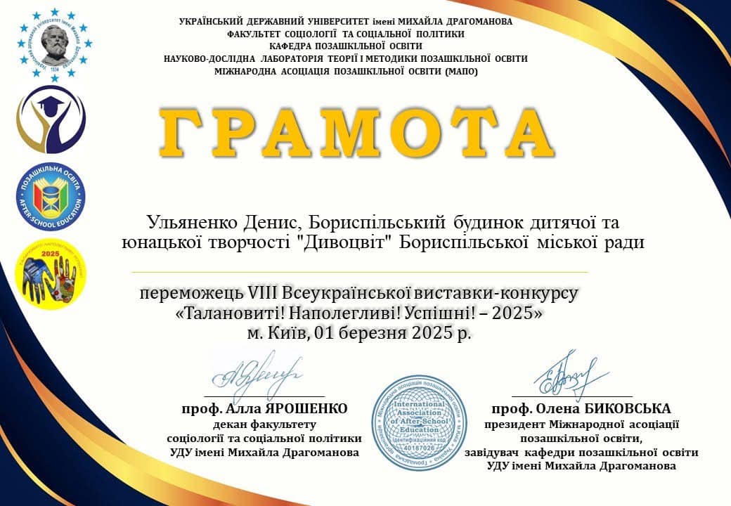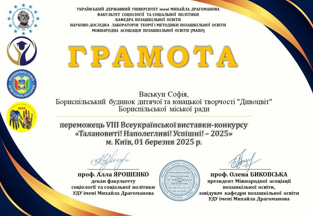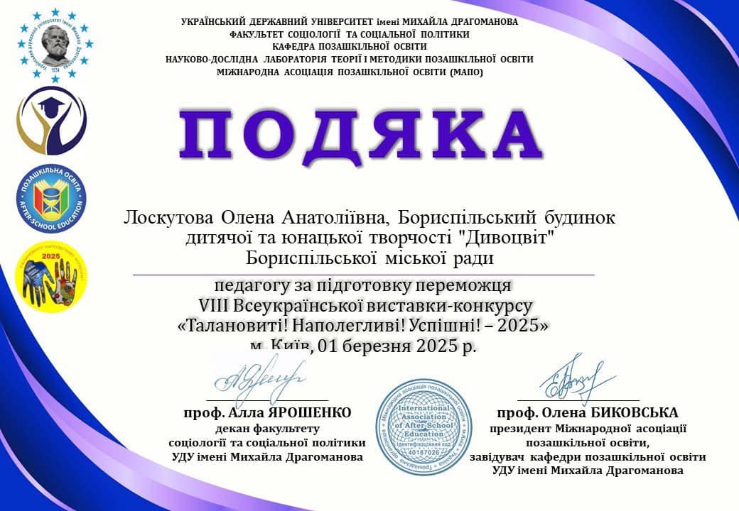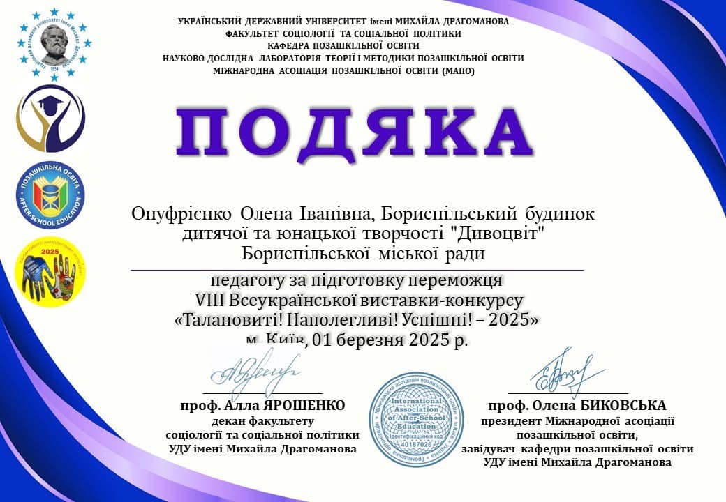 Отримали нагороди переможців та подяки за VIII Всеукраїнську виставку-конкурс «Талановиті! Наполегливі! Успішні! 2025». Дякуємо педагогам за наполегливу працю з вихованцями, за чудовий результат. Так тримати! А нашим переможцям бажаємо творчіх успіхів, натхнення та бажання творити прекрасне.