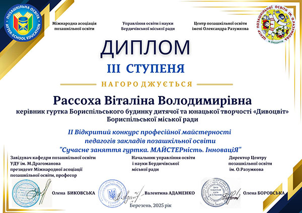 Лутфулліну Анну Вікторівну за диплом 1 ступеня та Рассоху Віталіну Володимирівну за диплом 3 ступеня в II Відкритому конкурсі-виставці професійної майстерності педагогів закладів позашкільної освіти «Сучасне заняття гуртка: МАЙСТЕРність.ІнноваціЯ».