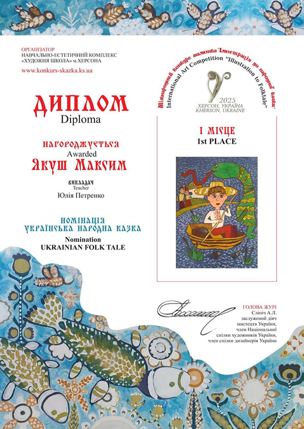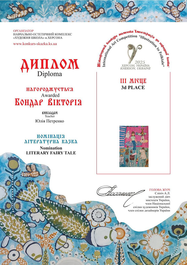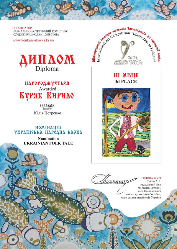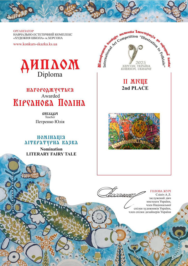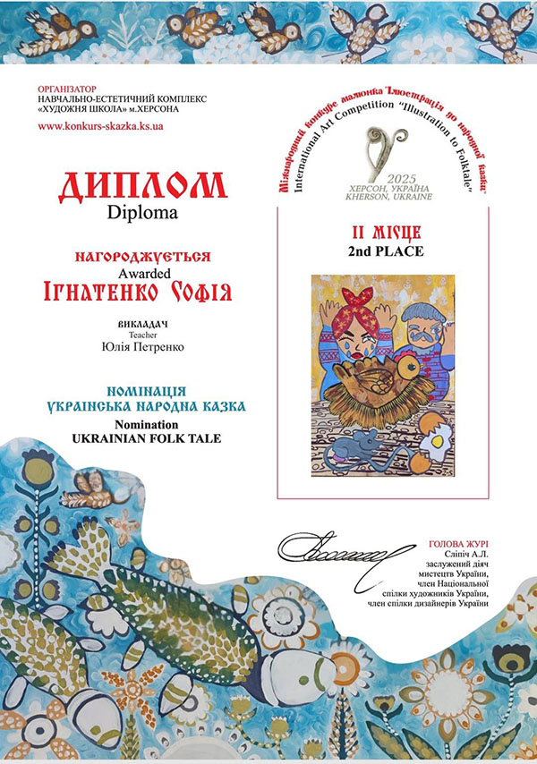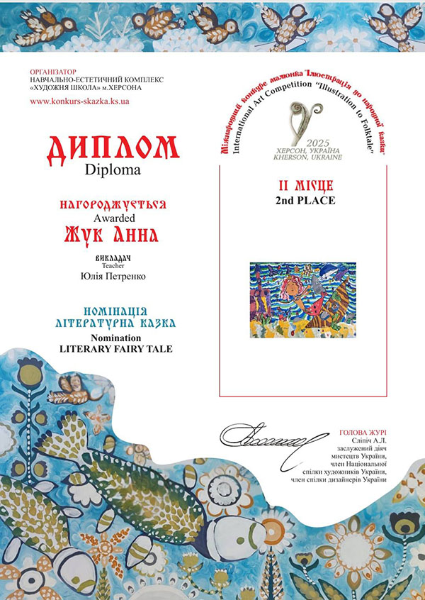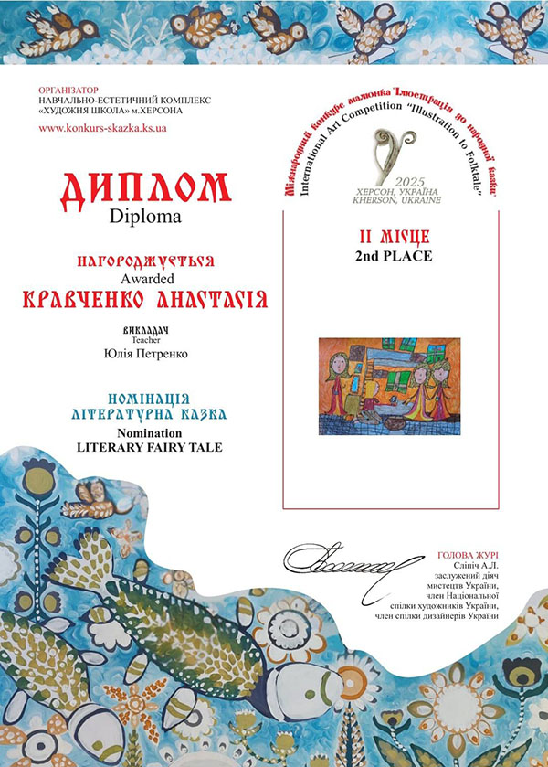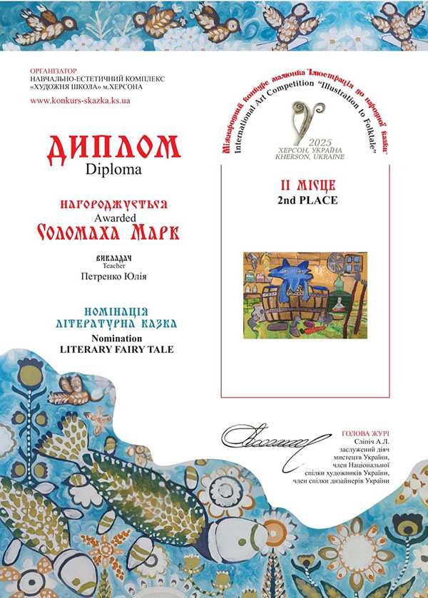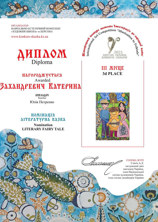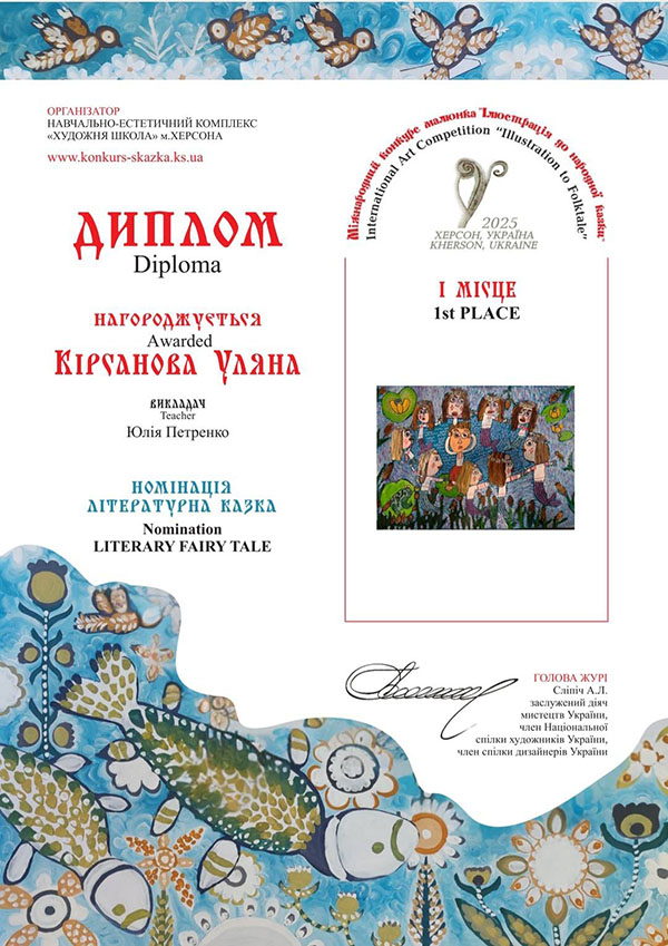 Вітаємо вихованців гуртка "Академія Олівця" з перемогами у Міжнародному конкурсі малюнка "Ілюстрація до народної казки". В конкурсі, який було започатковано у місті Херсон, цього року взяли участь 2397 юних художників з 202 навчальних закладів 23 країн світу: Австрія, Болгарія, Велика Британія, Єгипет, Ірландія, Іспанія, Італія, Китай, Литва, Німеччина, Польща, Румунія, Сербія, Словаччина, Словенія, США, Тайвань, Туреччина, Україна, Фінляндія, Франція, Чеська Республіка, Швейцарія. Міжнародне журі ретельно передивилось кожну роботу і обрало Гран-при, І, ІІ та ІІІ місця у шістьох номінаціях: «Казки народів світу», «Літературна казка», «Українська народна казка», «Власна казка», «Поліна Райко. Новий дім» та «Анімована казка».