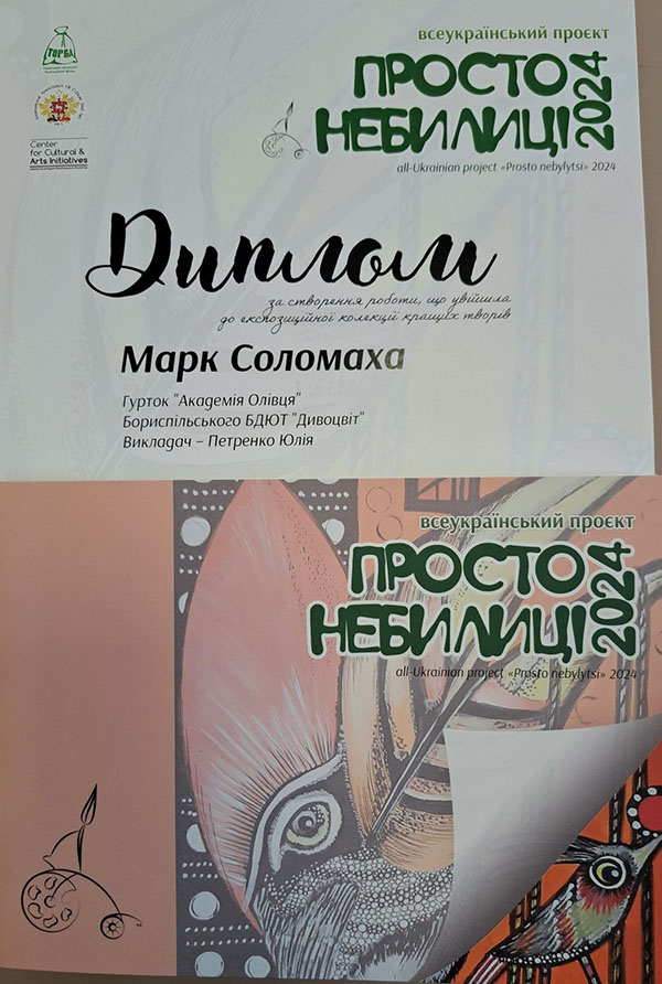 З черговою перемогою Марка Соломаху, вихованця гуртка "Академія Олівця" Бориспільського БДЮТ "Дивоцвіт". Його робота увійшла до колекції кращих творів Всеукраїнського проєкту "Просто небилиці 2024".