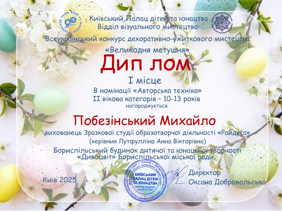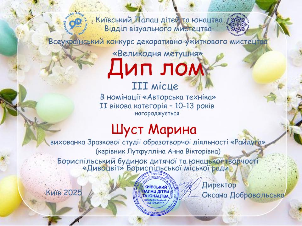 У всеукраїнському конкурсі декоративно-ужиткового мистецтва «Великодня метушня» вихованців зразкової студії образотворчої діяльності «Райдуга»: