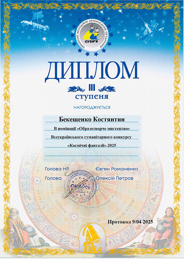 Бекещенко Костянтина - вихованця гуртка «Академія Олівця» - за 3 місце у Всеукраїнському гуманітарному конкурсі «Космічні фантазії-2025» в номінації «Образотворче мистецтво».