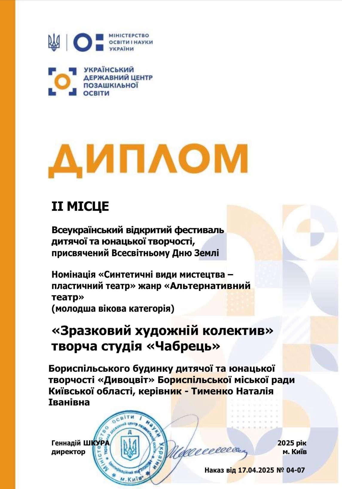 З перемогами у Всеукраїнському відкритому фестивалі дитячої та юнацької творчості присвяченого Всесвітньому Дню Землі зразкову творчу студію «Чабрець»: