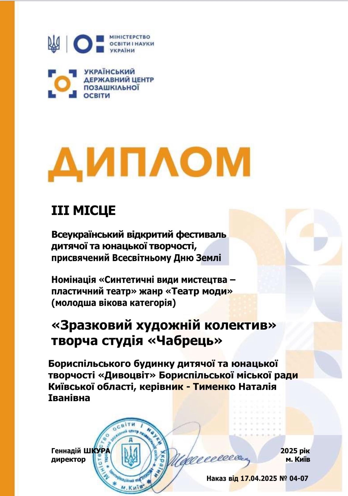 - за 3 місце в номінації «Синтетичні види мистецтва-пластичний театр», жанр «Театр моди» (молодша вікова категорія).