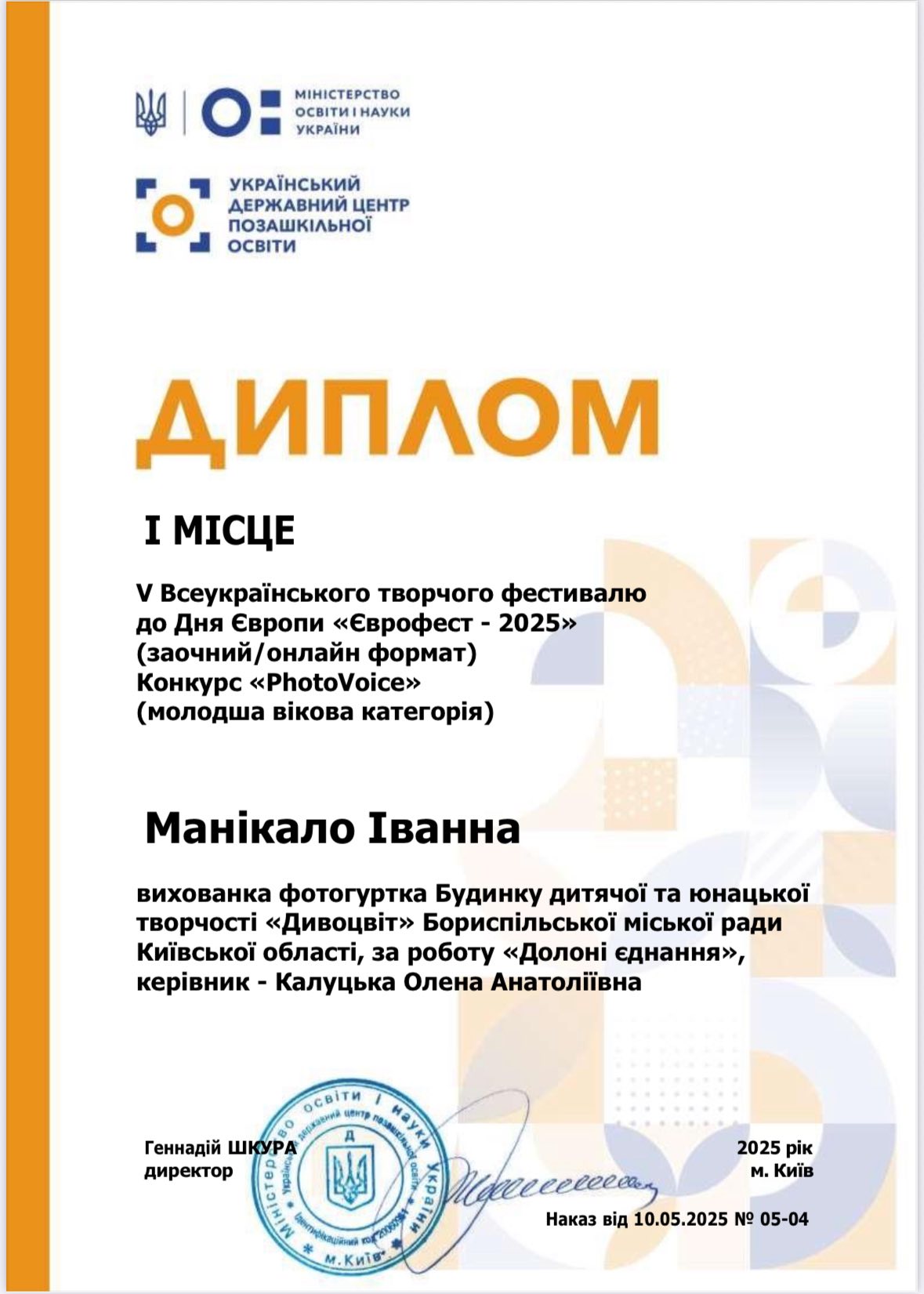 Манікало Іванну, вихованку фотогуртка (керівник - Калуцька Олена Анатоліївна), за роботу «Долоні єднання», що посіла 1 місце в V Всеукраїнському творчому фестивалі до Дня Європи «Єврофест-2025».