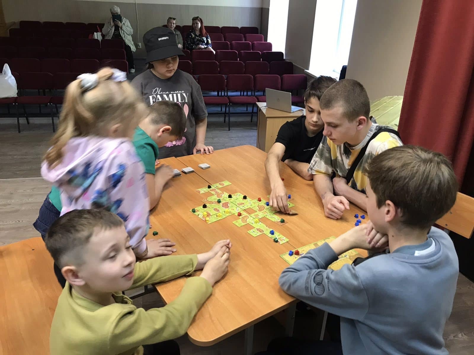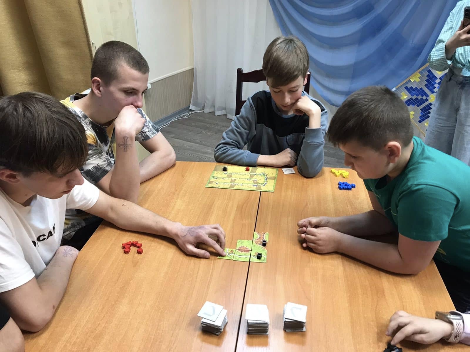 В нашому закладі - чудова подія! Вперше відбувся територіальний чемпіонат з настільної культової гри «Каркассон»! Це популярна настільна гра німецького стилю, де гравці створюють середньовічне місто, викладаючи на стіл плитки (тайли) із зображенням частин ландшафту (міста, дороги, монастирі, поля) та розміщуючи на них свої фішки (міпли). Мета гри - набрати більше очок, завершуючи будівлі та інфраструктуру на ігровому полі. Гравець вибирає плитки, які потім розміщує на ігровому полі, щоб вони з'єднувались з іншими плитами за принципом "доміно". Гра має прості правила, але за цим прихована стратегічна глибина, яка дозволяє гравцям продумувати ходи на кілька кроків вперед.
