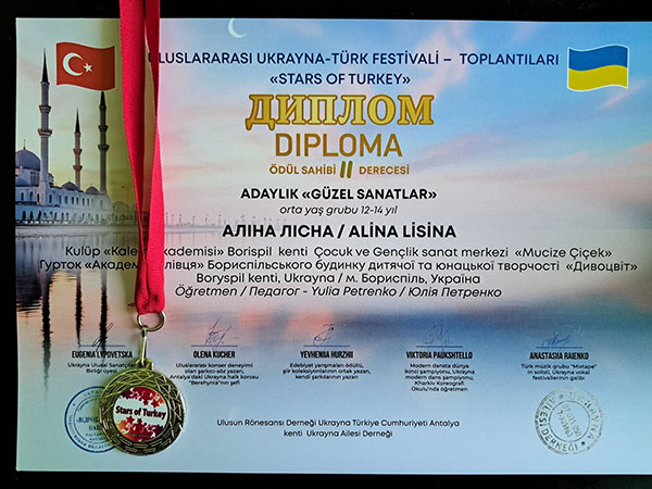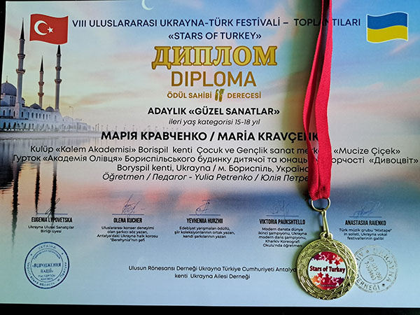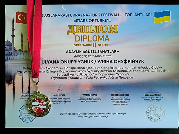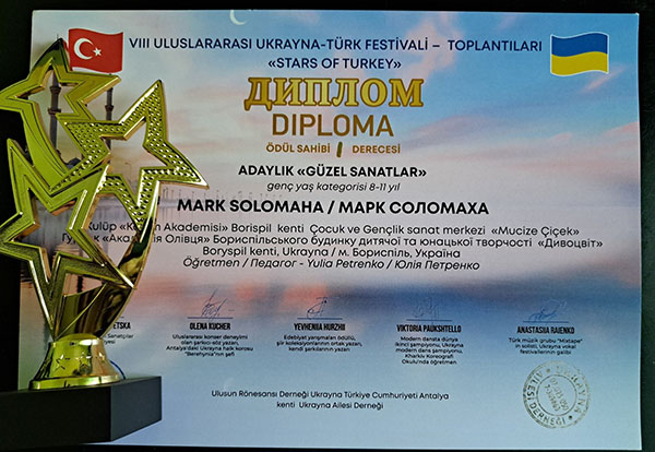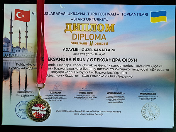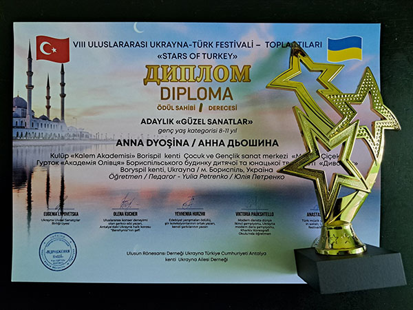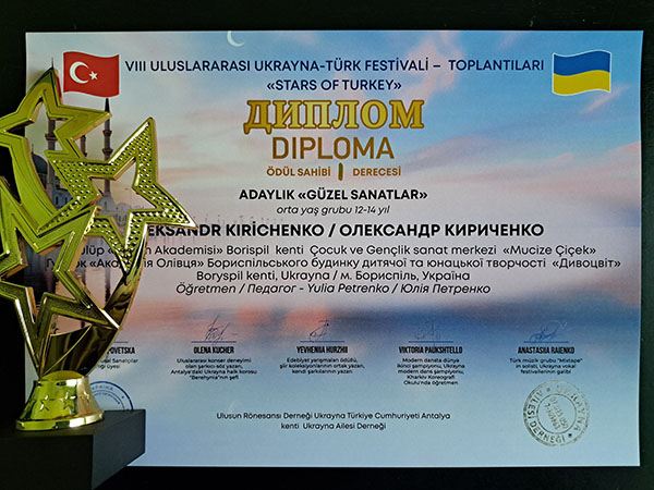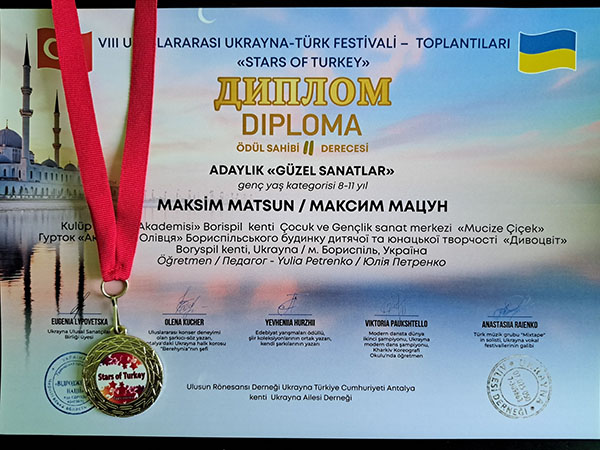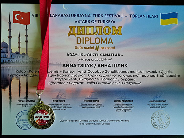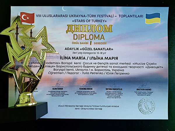 VIII Міжнародний україно-турецький фестиваль-зустріч "STARS OF TURKIYE". Справжнє свято талантів — 8-й Міжнародний дитячий фестиваль-конкурс "Зірочки Туреччини" — відбулося в мальовничій Анталії за підтримки Консула України в Анталії пана Олександра Вороніна. Свої творчі доробки на фестивалі гідно представили й вихованці гуртка "Академія Олівця" Бориспільського БДЮТ "Дивоцвіт". Наші юні митці не лише продемонстрували високий рівень майстерності, а й вибороли заслужені перемоги, вкотре прославивши Україну на міжнародній арені!