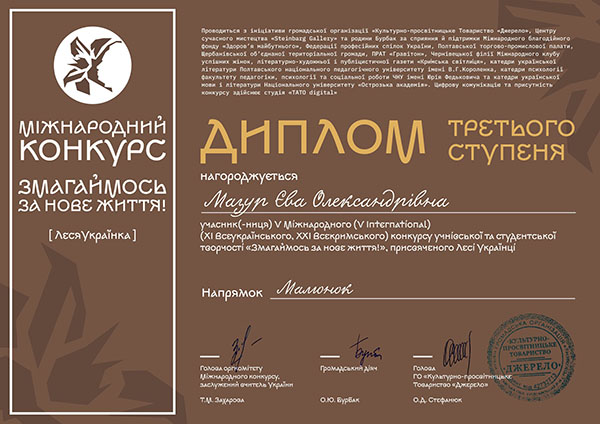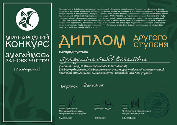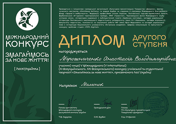 З перемогою в Міжнародному конкурсі учнівської та студентської творчості "Змагаймось за нове життя", присвяченого Лесі Українці, вихованок Зразкової студії образотворчої діяльності «Райдуга»: