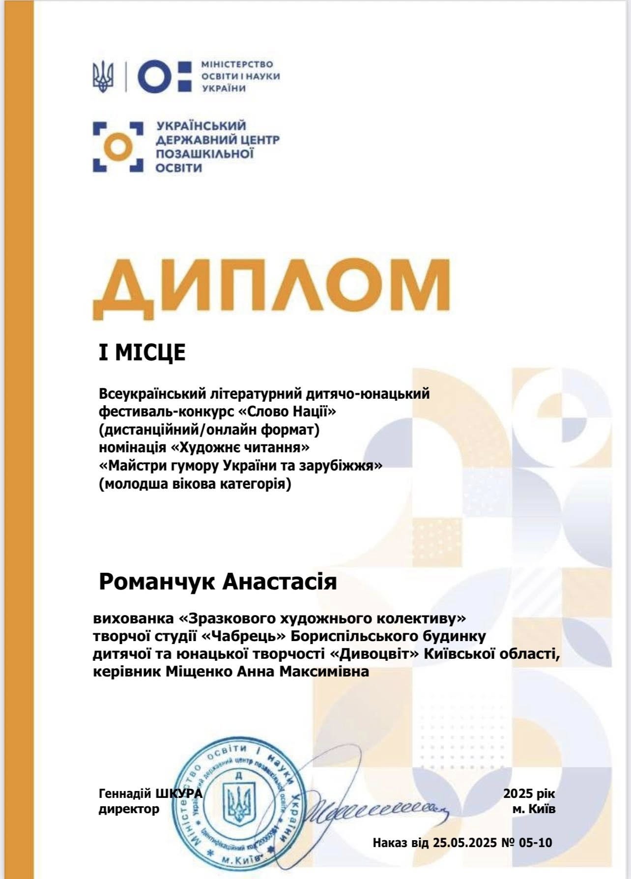 - Романчук Анастасію, вихованку «Зразкової творчої студії «Чабрець» (керівник Міщенко Анна Максимівна);