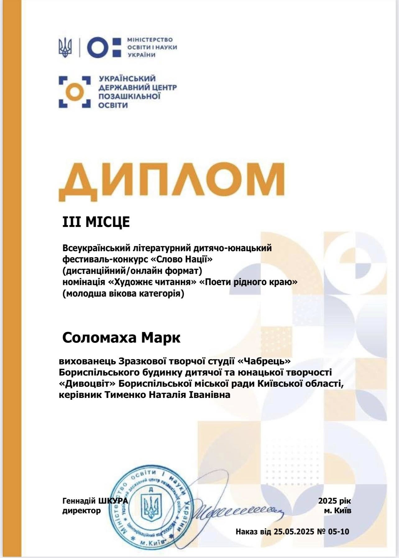 - Соломаху Марка, вихованця «Зразкової творчої студії «Чабрець» (керівник Тименко Наталія Іванівна);