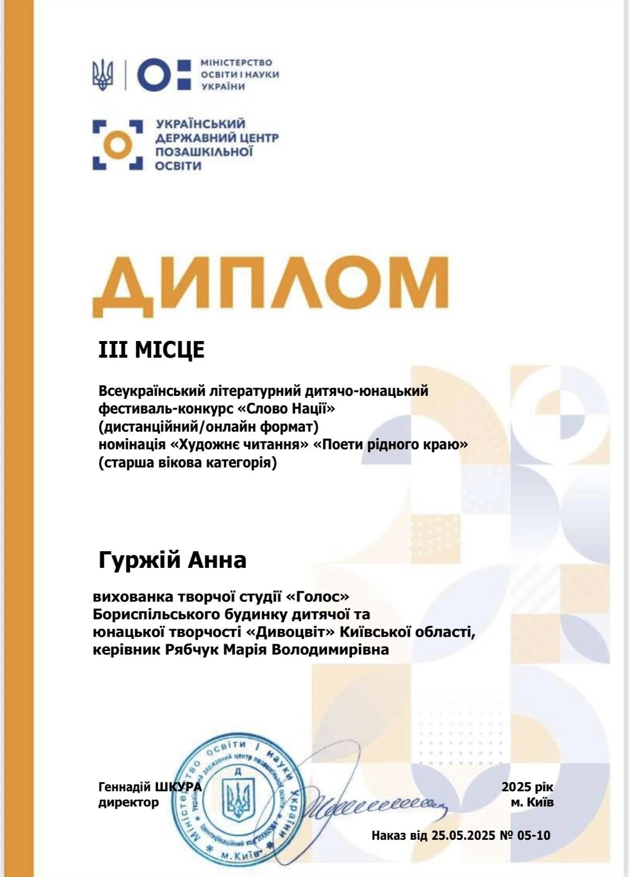 - Гуржій Анну, вихованку творчої студії «Голос» (керівник Рябчук Марія Володимирівна).